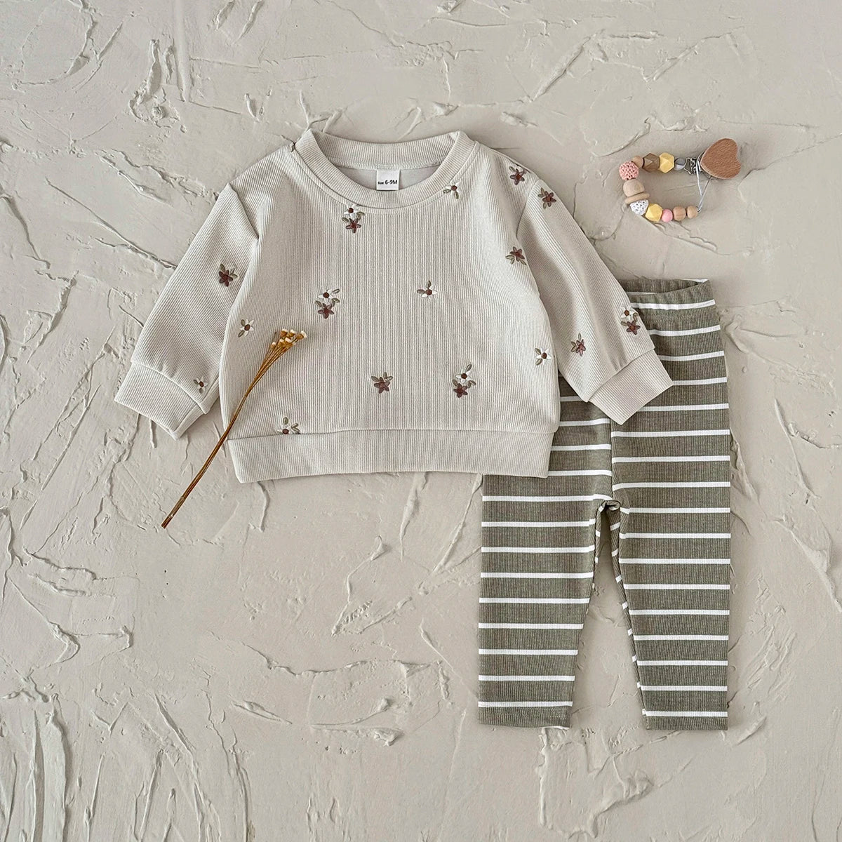 Floral Embroidered Top Striped Pant Set